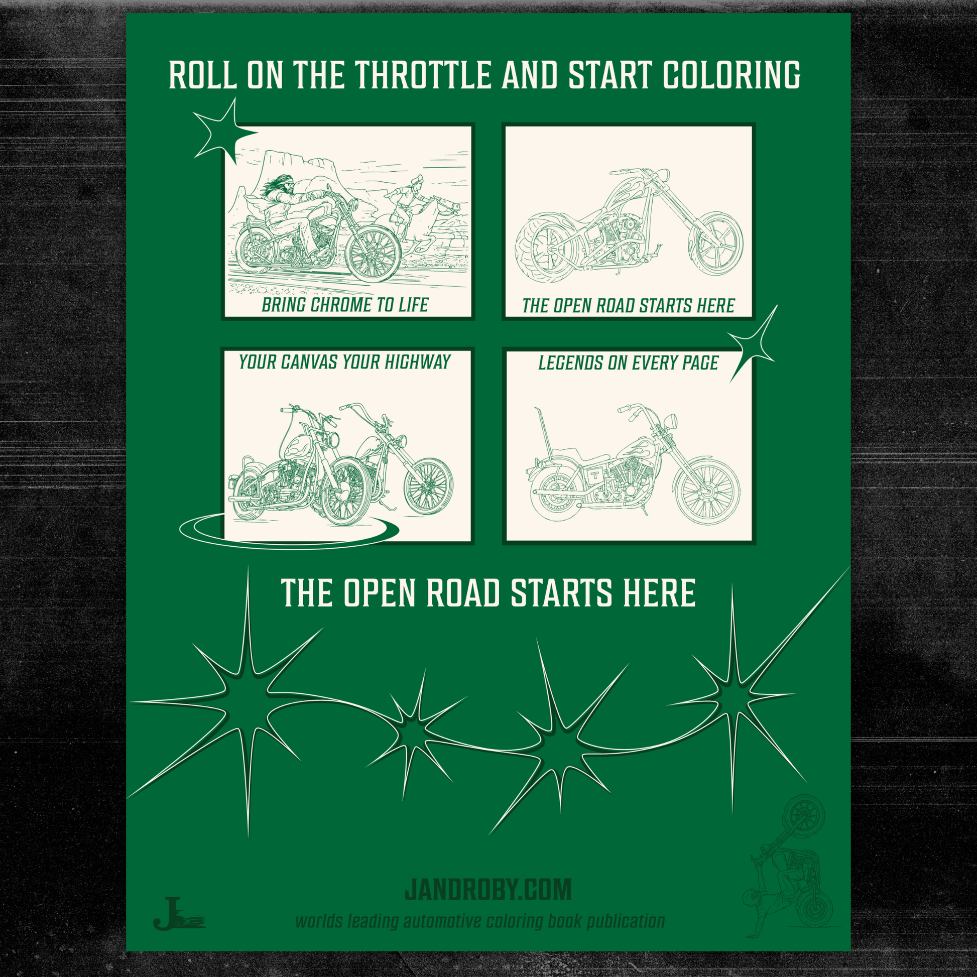This is more than just a coloring book, it is a celebration of motorcycle culture. Whether you're a lifelong rider or new to two wheels, these pages bring the art, attitude, and freedom of motorcycles to life.