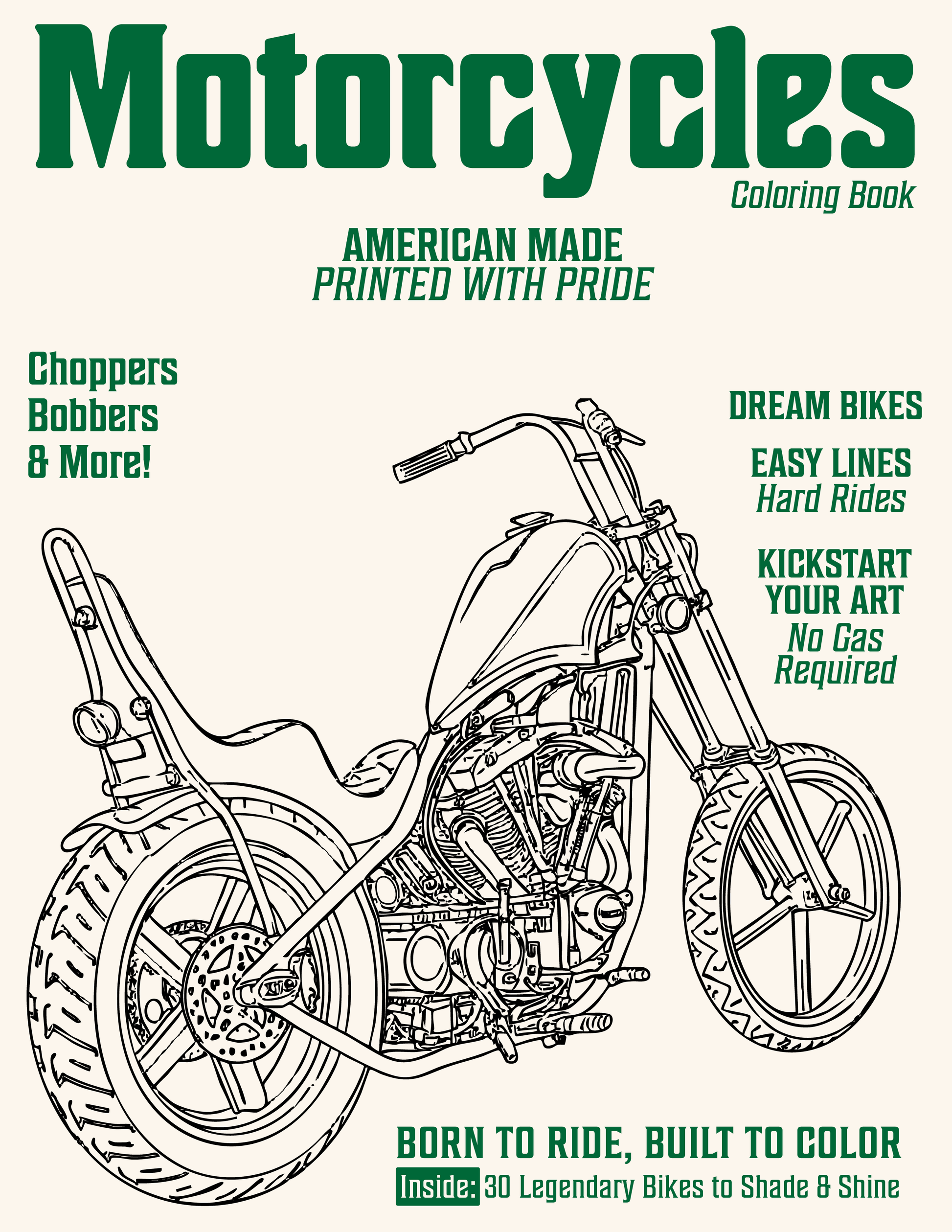 A high-quality motorcycle coloring book designed for riders and builders of all ages. From vintage classics to modern custom builds, every page captures the stance, detail, and character of iconic motorcycles.